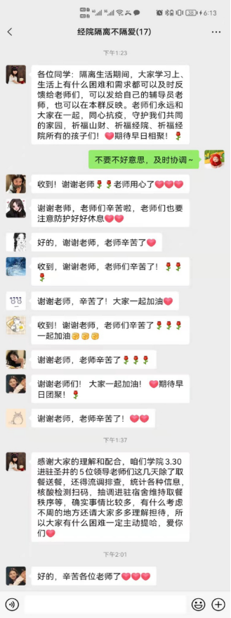 长时间的封校封宿,不免有同学会出现情绪上的波动。学院为加强学生的心理健康建设,安排老师们针对学生心理健康教育问题进行疏导安抚。全体研究生导师逐一与自己所带学生谈话并做好相关记录,辅导员与班主任们关心同学们封校期间的心理状态,对网课的接受程度,对生活学习的影响等。积极疏导安抚学生因封闭而产生的情绪波动,引导学生正确对待疫情,缓解学生心理压力。这不仅增强了学生们战胜疫情的信心,也很好地将老师们的爱心传递,用爱和责任守护了每一位学子。